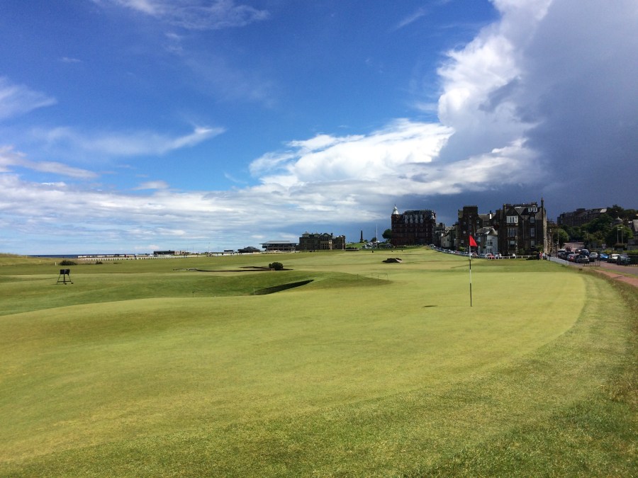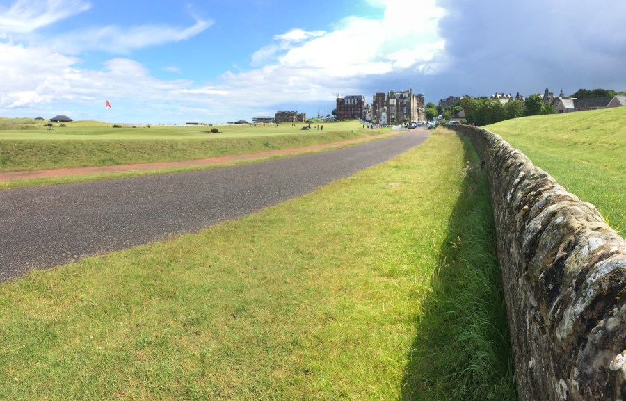 After that, we lugged our bags back to the car and drove through alternating sunshine and torrential rain to St Andrews. Melbourne talks about four seasons in one day, but here that happens every hour. At lunch yesterday we went through two full cycles, and I think the 1.20 hour drive today had three at least. However, with a little hassle actually locating the clubhouse, I got to walk around the 1st, 17th and 18th. The 17th at St Andrews is probably one of the two most famous holes in the world and definitely the one I was most curious to see in person, and it didn’t let me down.  I was surprised how close the road and paths are to the 18th green, but even more so to be able to walk along the road at the 17th, the Road Hole. The pin was cut way right and I saw players finish up on the road, and so my sense of the place was deliciously filled in. I still want to come back here to play one day, and I resisted the urge to walk on the green until I can.