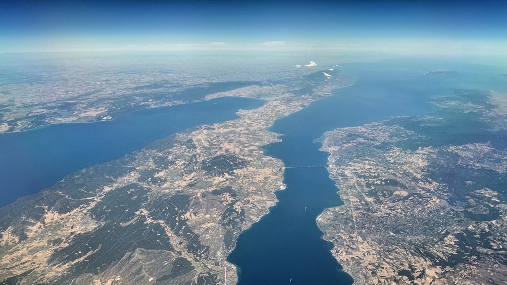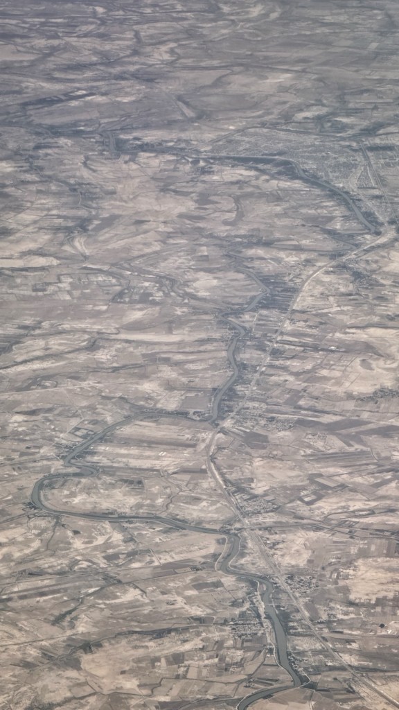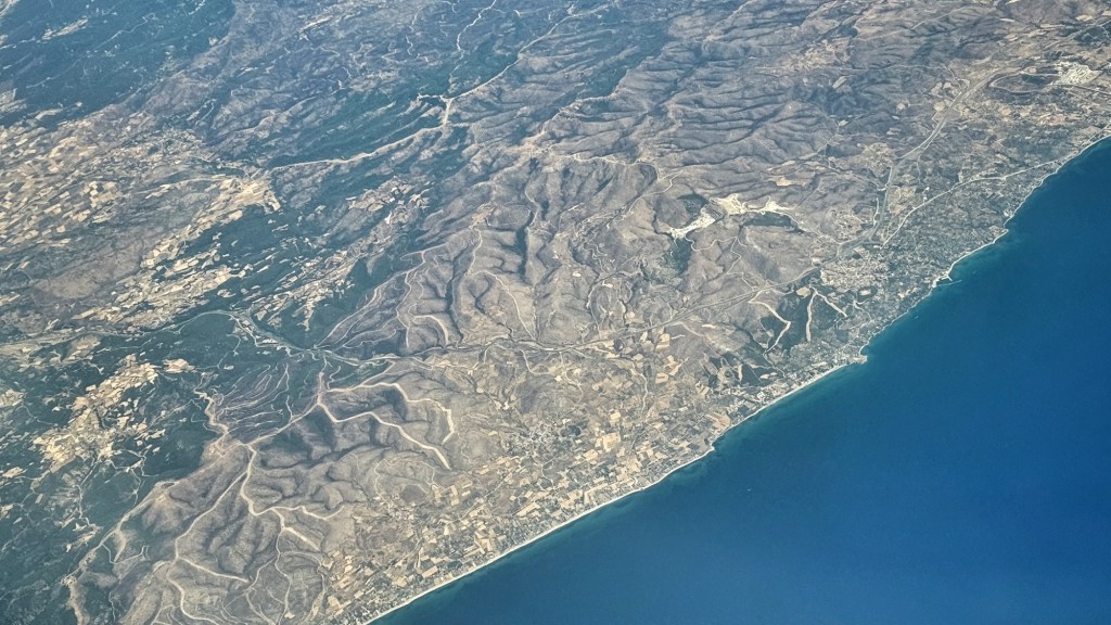 We had a taxi booked for 4.15am, and happily it was waiting for us when we snuck down to the foyer. It was already showing 30 degrees outside, and there were a surprisingly large number of people out and about, and the airport was in full activity mode when we arrived. The tour guide yesterday had claimed the government had taken over the airport and that nothing there would work properly, but we found it clean and organised, and the flight left exactly on time. We comfortably made the connection to Larnaca – probably the last transport step that we really cared about on the trip. The flight down came over Romania and then across the Gallipoli Peninsula, which was fascinating to see from the air.