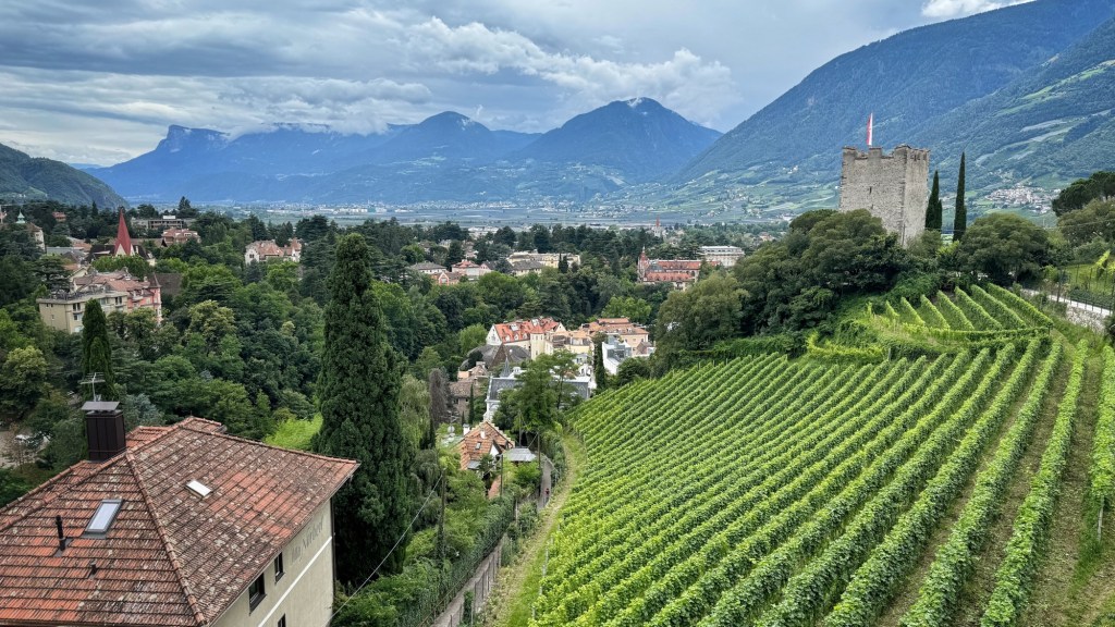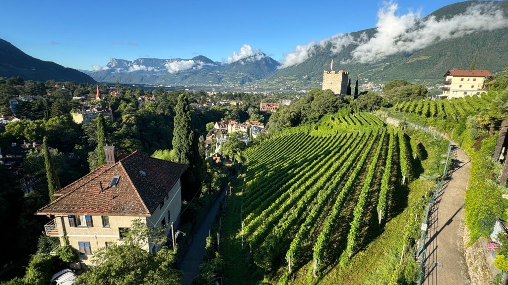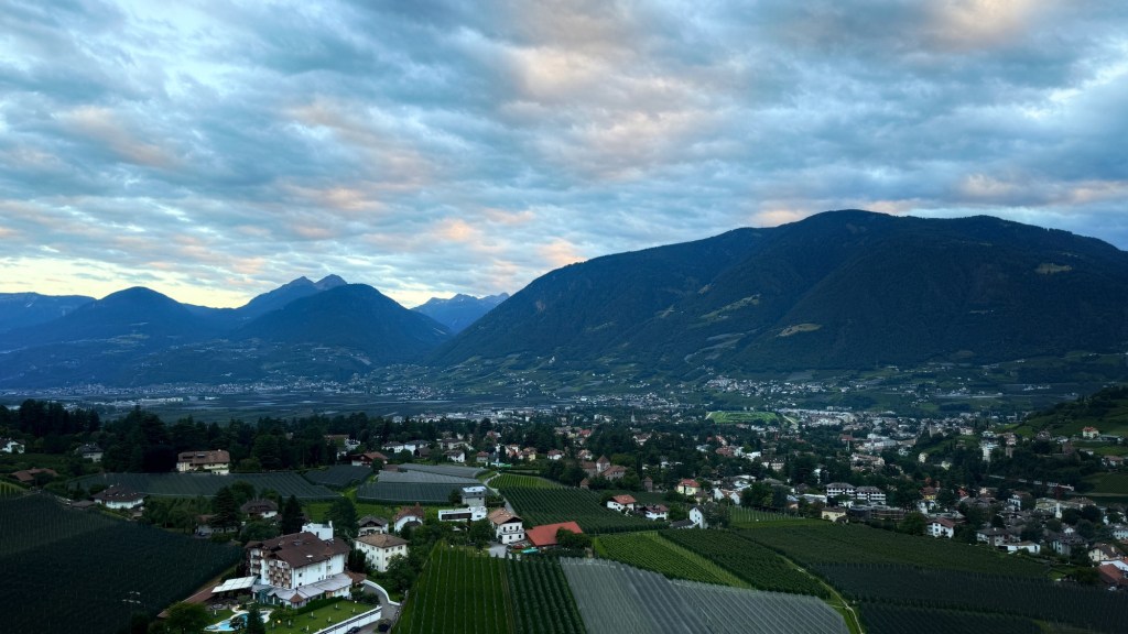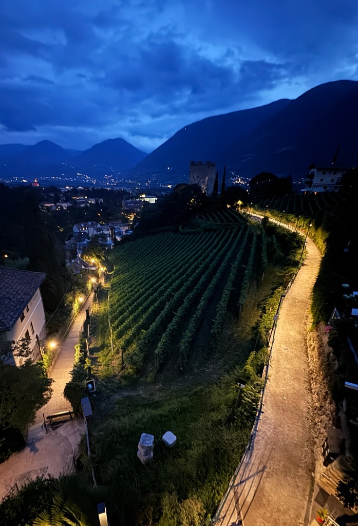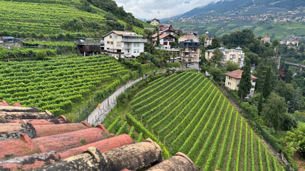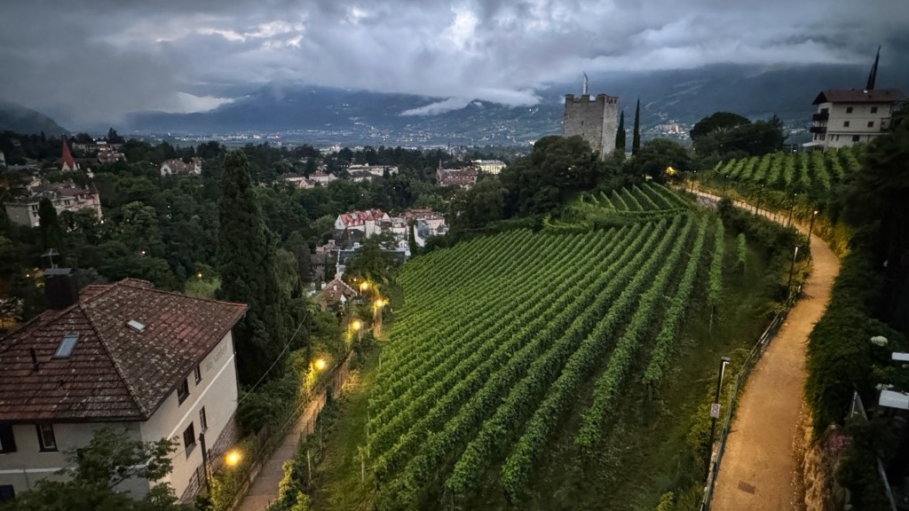 Wow, it’s been something, these last few days. From sitting on our deck at home, to boarding a plane in 35 degrees at 8am, to a snowy mountain pass at 2,400m, to dinner in a fancy restaurant with wine made on site, to sitting out on a balcony at 9.30pm in the fading dusk looking across vineyards and medieval structures and watching the lights of Merano come alive in the valley – that’s a lot to take in over something like 56 hours. A lot.
