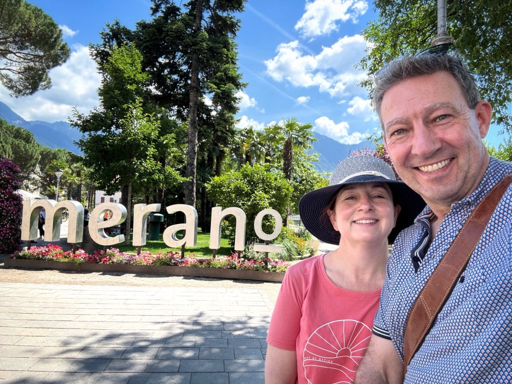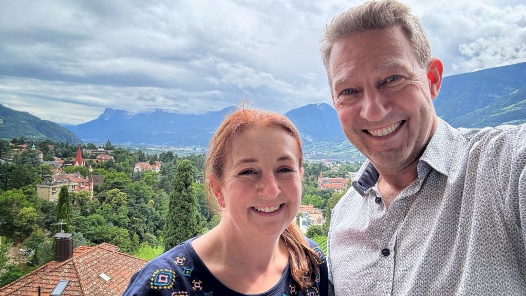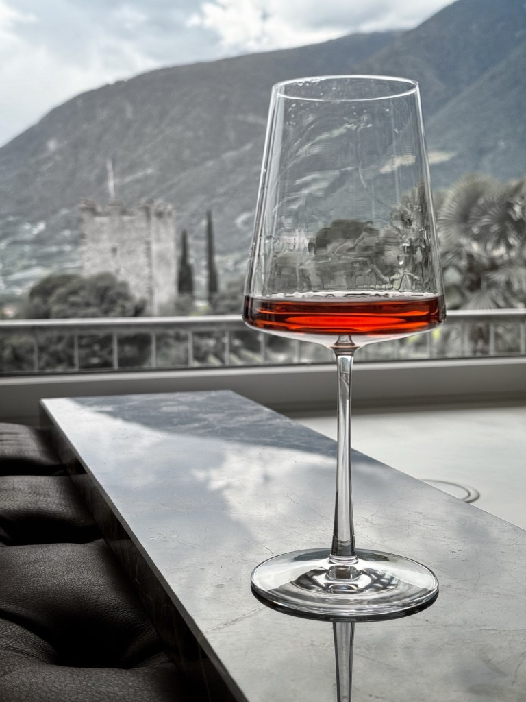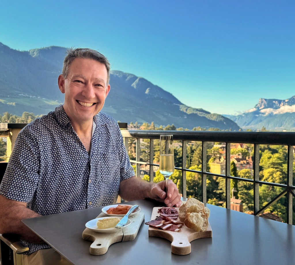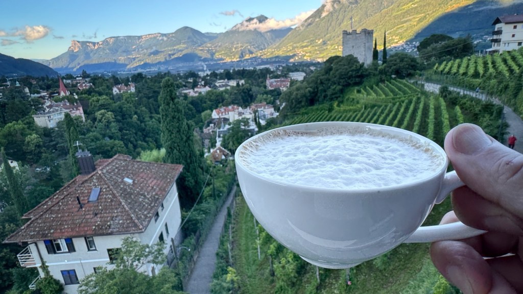 Wow, it’s been something, these last few days. From sitting on our deck at home, to boarding a plane in 35 degrees at 8am, to a snowy mountain pass at 2,400m, to dinner in a fancy restaurant with wine made on site, to sitting out on a balcony at 9.30pm in the fading dusk looking across vineyards and medieval structures and watching the lights of Merano come alive in the valley – that’s a lot to take in over something like 56 hours. A lot.