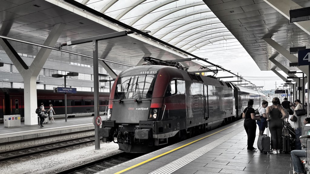We chose last night’s hotel specifically to be walking distance to the old town, but more specifically to be easy (or at least practical) walking distance to the train station this morning. Well that proved prescient and valuable, with us lugging the stuff packhorse-style to the Salzburg HBF train station comfortably on time.