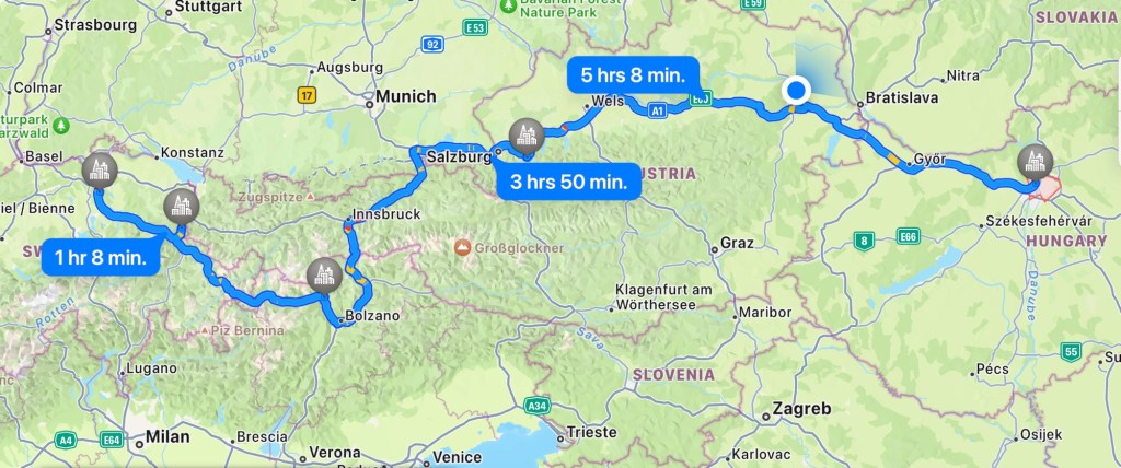 Since we flew into Zurich, some 9-10 days ago, we’ve made our way steadily eastwards to Budapest, the capital of Hungary. It’s not been the most direct route possible, but here we are for 36 hours, about 1,000km due east.