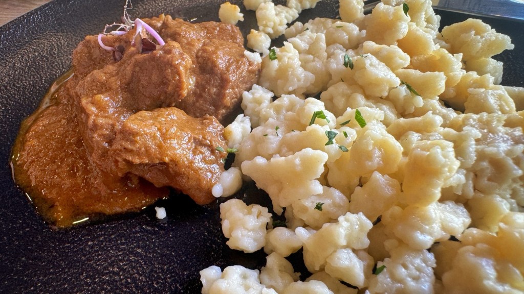 The food part of the tour was very tasty – starting with apple and poppyseed strudels (Hungarian strudel has paper-thin pastry – literally a wrapping to hold the filling in); langos (think – flat doughnuts with cheese and savoury toppings, pizza-like, but not pizza at all); a strawberry soup (literally!); a fabulous crepe with slow-cooked chicken and a paprika sauce; and a choice of veal or mushroom goulash with handmade nokedli (a kind of gnocchi / dumpling / pasta). It was all very good actually, and a great way to spend a few hours in an unfamiliar city.