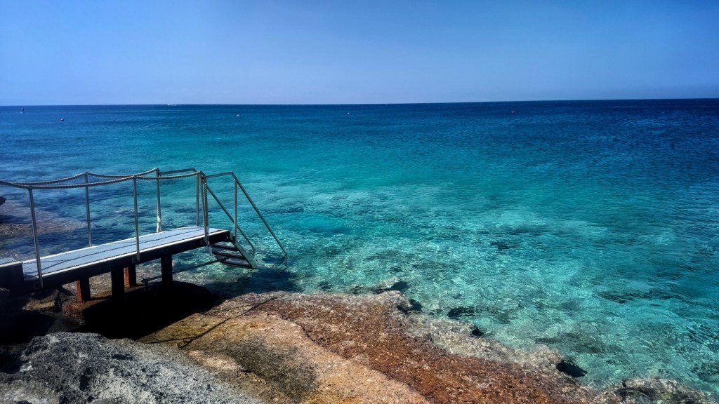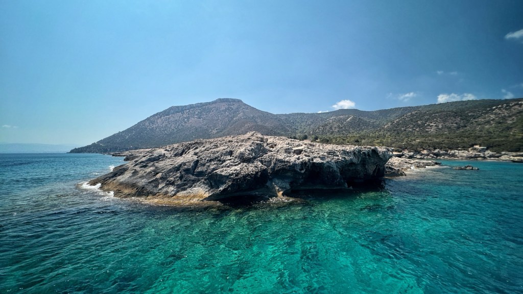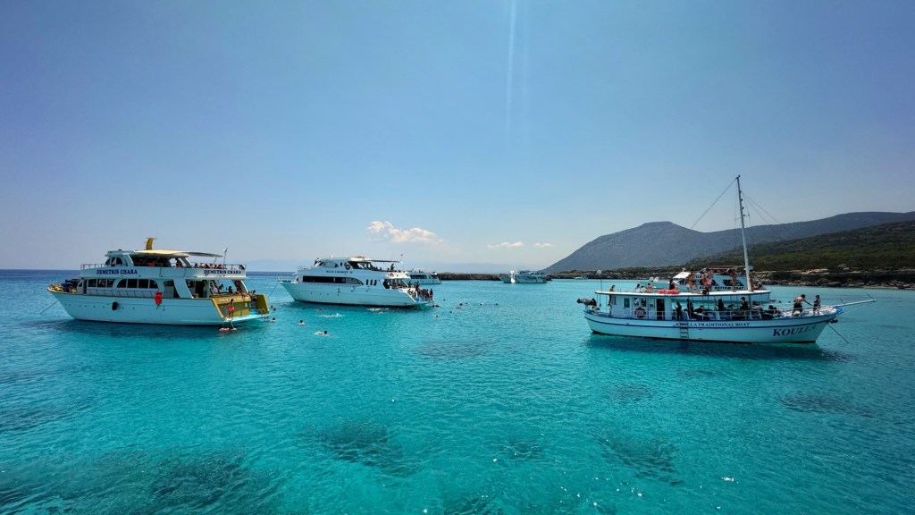 This morning, after a lovely breakfast in the cool of the courtyard in the early morning, we headed north for a 3-hour cruise to Aphrodite’s Bath and a swim at the Blue Lagoon. The water is a stunning colour and so clear – reminds me of the water in the Adriatic, for obvious reasons.