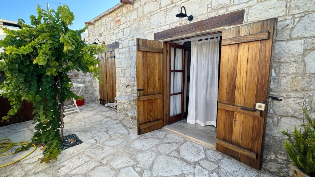 After a quick meal, we hit the road for the Paphos region to the west. They had rented a very cool renovated house in a village called Kathikas, and it was an absolute delight – two old stone buildings with an interior courtyard and covered area. Spectacular.