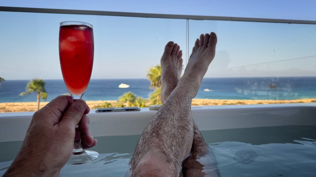 The place we are staying in turns out to be an all-inclusive package arrangement, so it seems like this won’t be the start of the post-holiday diet!! We tried to upgrade the room, but it turns out we’d already booked the best one, with one of the few front rooms and its own spa on the balcony (where I will likely shortly be moving to!). It’s been nice to have a pretty low key afternoon, and the plan tomorrow is basically to do a walk, then have long massages and a final dinner, before commencing the homeward journey… always a bittersweet moment. For now though, we are enjoying ourselves here!