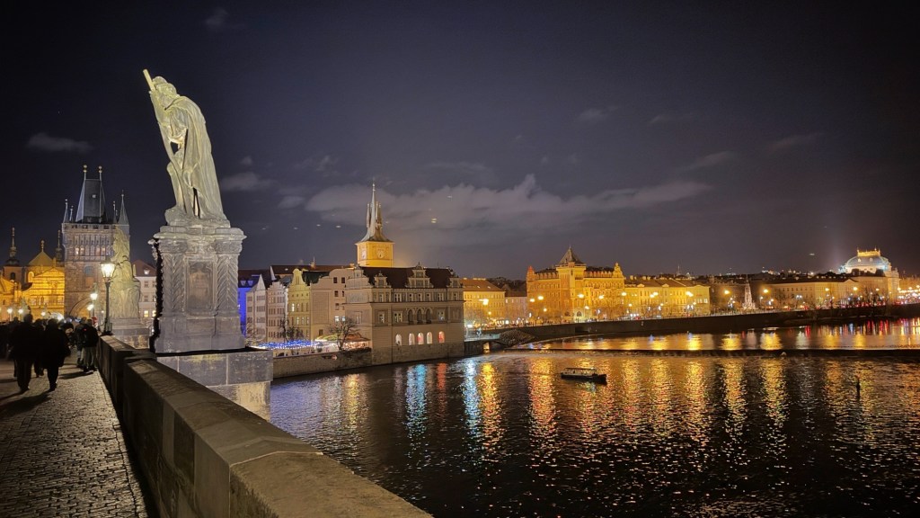 Well, it’s been a long day. In a descriptive sense, we boarded the plane in Melbourne around 11pm, flew to Doha, had tea at Harrods, flew to Prague, got driven from the airport by a taxi driver with one eye and fewer teeth (but she did a great job, five stars, would recommend), walked around the old city (multiple times – tired procrastination not helping), and then had dinner on a boat overlooking the castle.