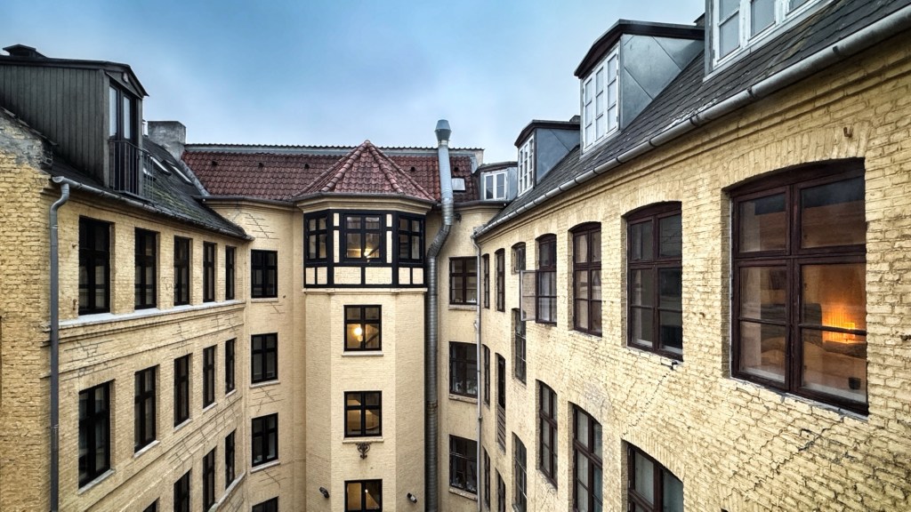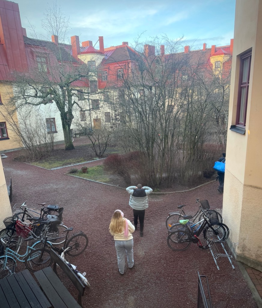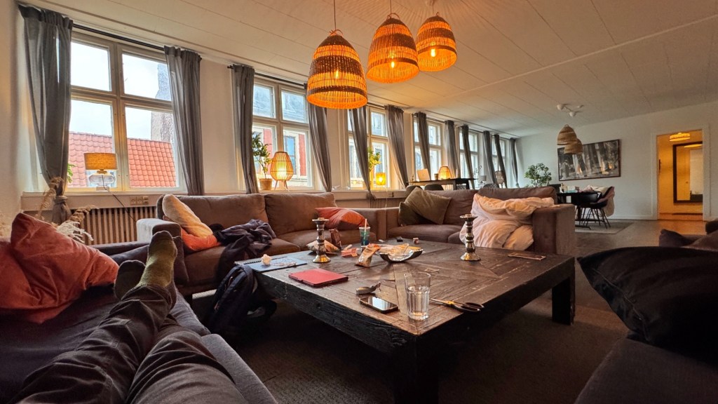 Also, we are not unhappy with Copenhagen so far. The apartment is 6 bedrooms, giving us all a choice, and has a massive living space with various different places to hang out, overlooking a pedestrian mall and shops.