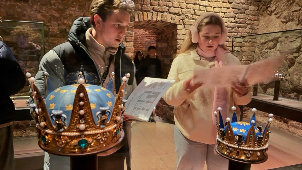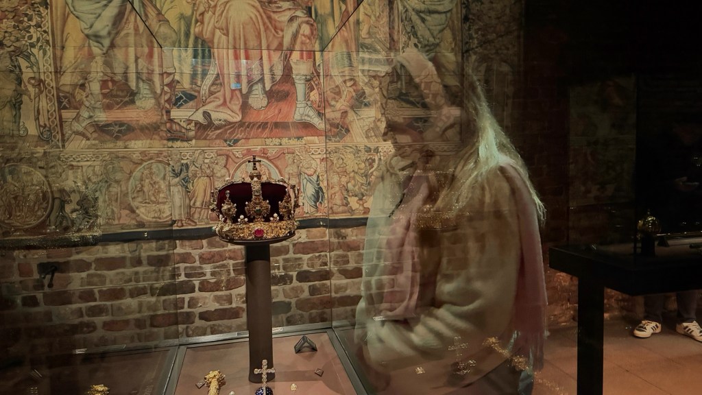 As we passed the palace, Aidan noticed there was an opportunity to view a display of the Crown Jewels and other historic regalia, so we went down into the dungeon to do that.