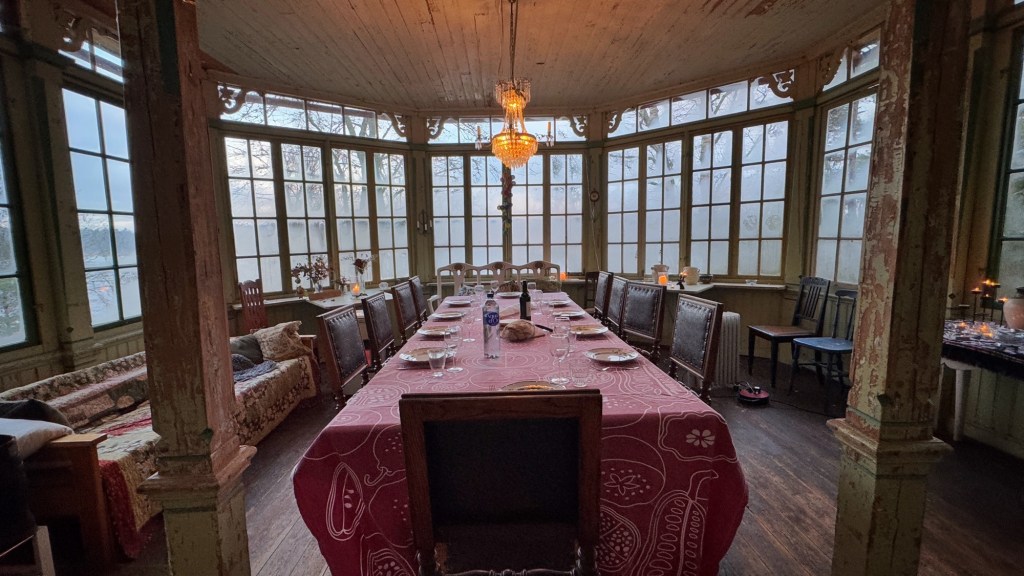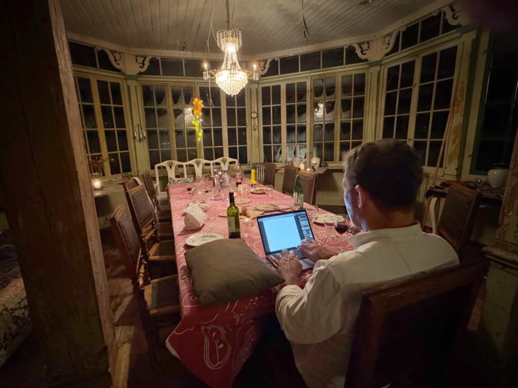 As I write this, we are sitting up the top of a big blue double decker bus, heading back to Stockholm from Waxholm, a gorgeous town from where the ferries run over to the island where Therese and Anthony own a massive old house called Hedvigsdal. Just telling the story of its current ownership involves multiple wars and family machinations, and the building itself is in this fluid state of it trying to quietly fall apart while the people steadily try to save and gently renovate it.