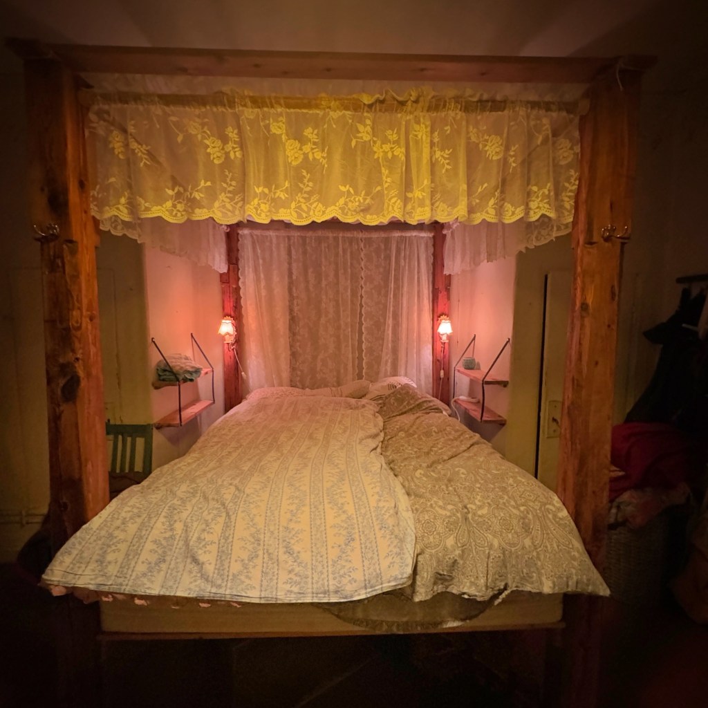 We spent the night in a variety of bedrooms scattered through the house and pre-warmed – with Aidan in a small separate cabin overlooking the main house, only slightly nervous about the supposed badger out there with him.