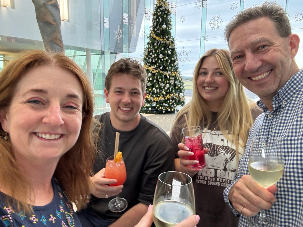 Anyway, for now we are through security, and living it up at the bar. So far, Justine has bought all the drinks on the entire trip. Let’s see how long that will last…