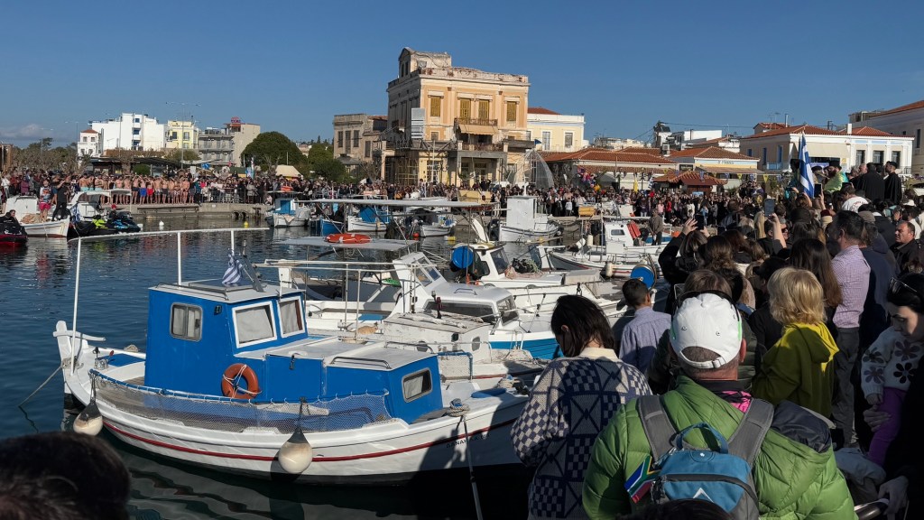 Today then turned out to be Epiphany, a fairly major religious holiday here. The main ceremony involves a priest throwing a wooden cross into the water, and a bunch you mostly young men having a swimming race to see who can get it first. It attracted quite a crowd!