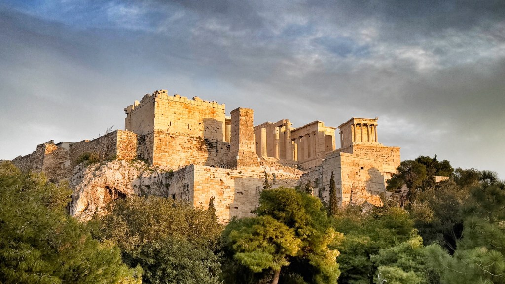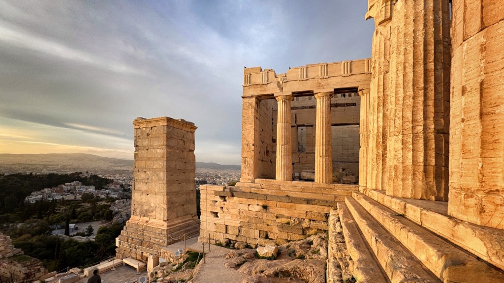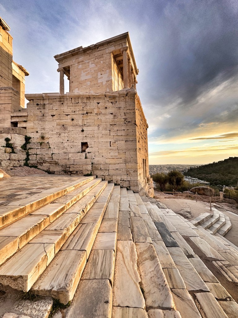 To cap off the day, we could see that at some point late in the day, the sun was going to pop out from the clouds, and the prospect of a glorious few minutes of golden hour beckoned. Against the encroaching chill, we hung around to see what happened. Well, what happened was something magical. The Acropolis was bathed in the purest golden light for maybe 20 minutes, and there was hardly anyone there to see it aside from us.