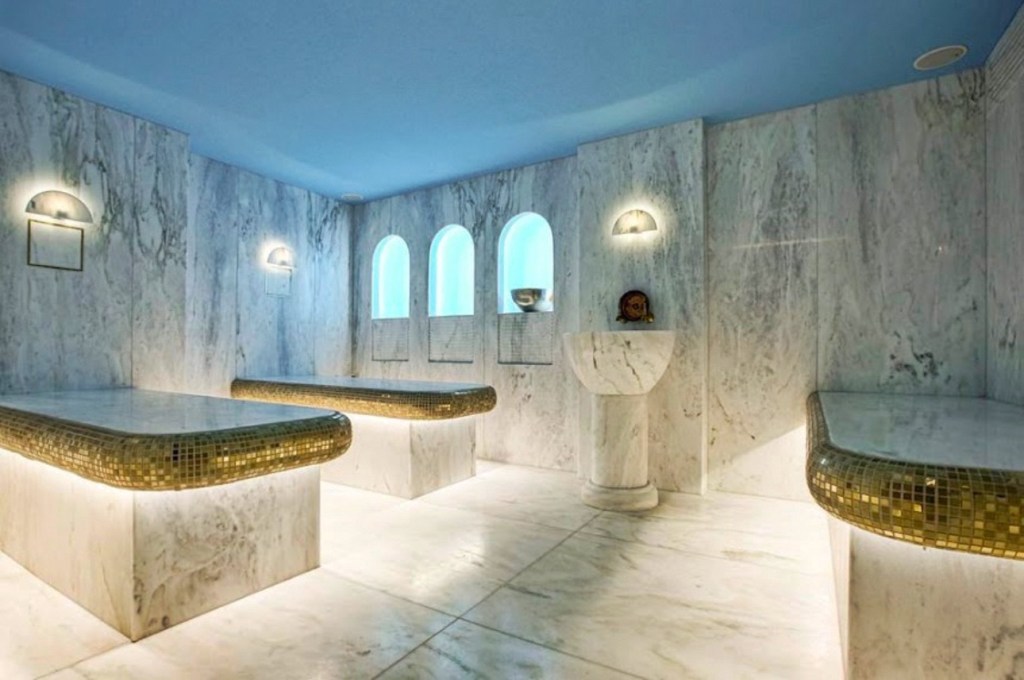 After changing into the obligatory disposable undergarments, we were taken into the waiting area of the spa. This is a marble bench inside the door, where you acclimatise to the heat by being drenched in warm water, and sitting for 10-15 minutes (while around the corner the previous customer is doing their massage). We were then moved to the majestic marble treatment benches.