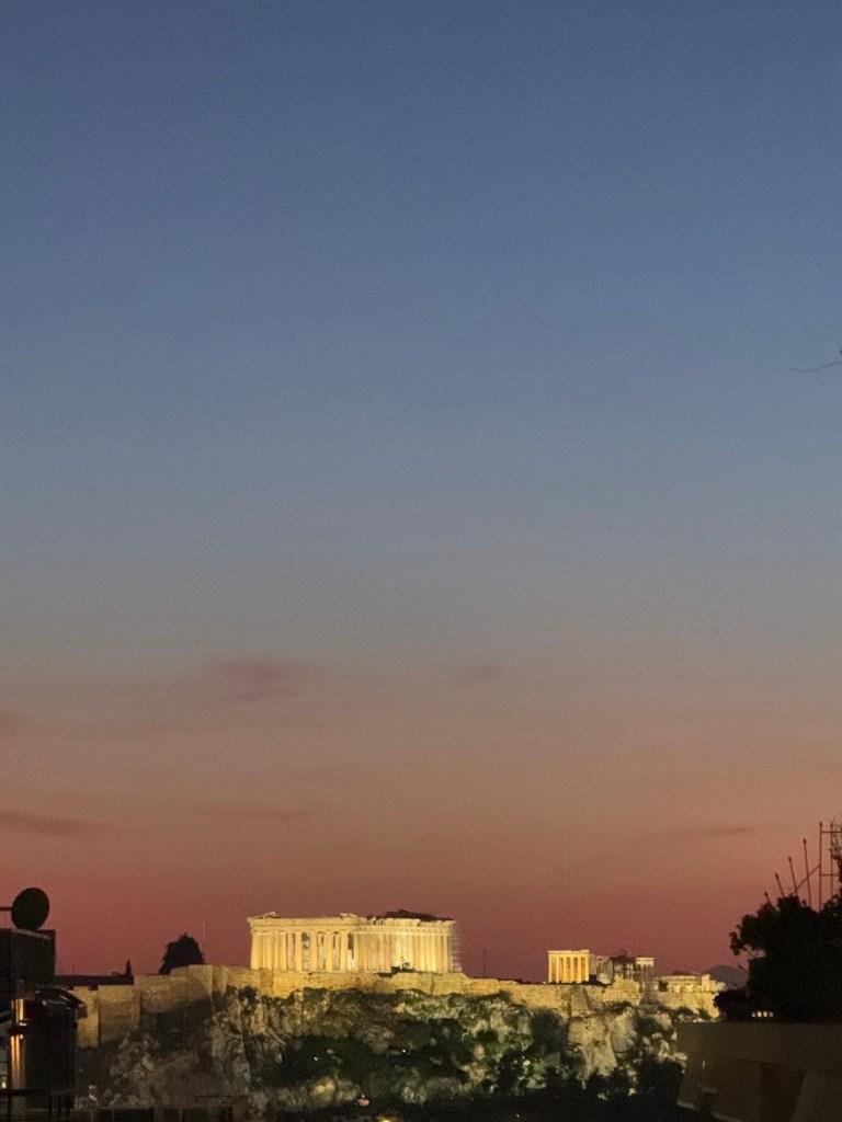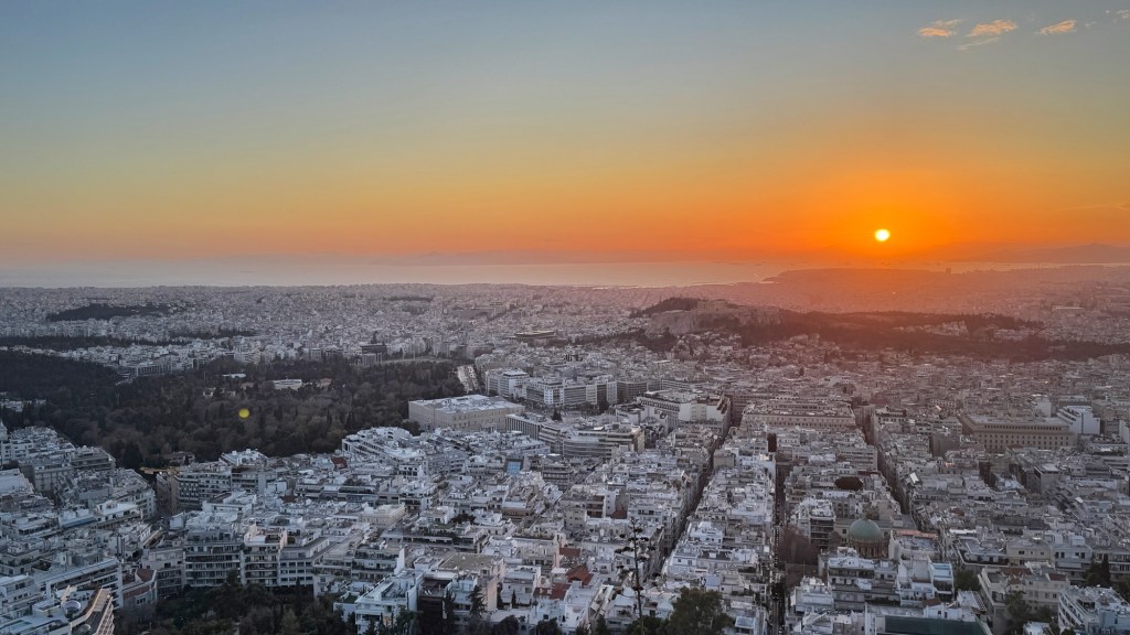Athens is an interesting city. It seems to stretch forever, yet is just a fraction the size of Melbourne or Sydney. Watching the sun set over Aigina, and the lights coming on across the glacial white city, it was hard not to feel some odd combination of history and modernity.